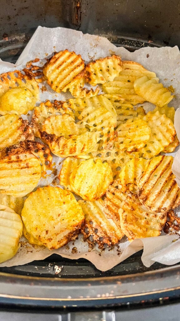 The waffle shape creates more surface area, which means more crispy edges and plenty of spots for seasoning to cling to. After slicing the potatoes, the fries are soaked in ice water to remove excess starch, then tossed with butter and simple seasonings before being air fried until golden and crispy.