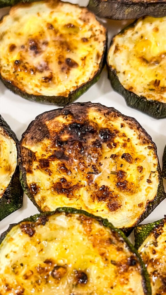 Fresh zucchini rounds are tossed in melted butter and seasoned with garlic salt, pepper, and garlic powder, then air fried until golden and crispy on the edges.