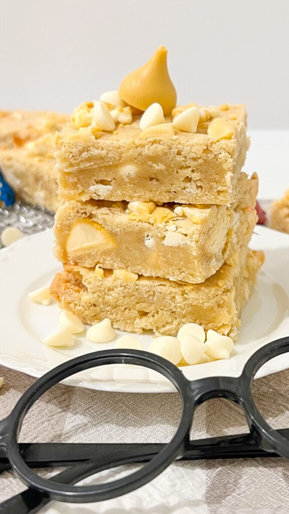 These blondies are one of those desserts that feel a little special but are still incredibly easy to make. I love how the butterbeer flavor comes through in every bite, especially from the melted chocolate on top.