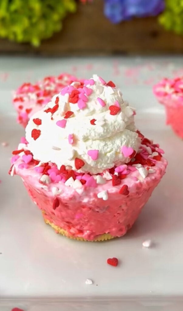 These little cheesecakes might be one of my favorite Valentine’s desserts I’ve ever made. I love how soft and creamy they are, and the pink and red layers make them feel extra special without requiring any baking at all. The Golden Oreo on the bottom adds the perfect crunch, and the white chocolate chips in the pink layer are such a fun surprise.