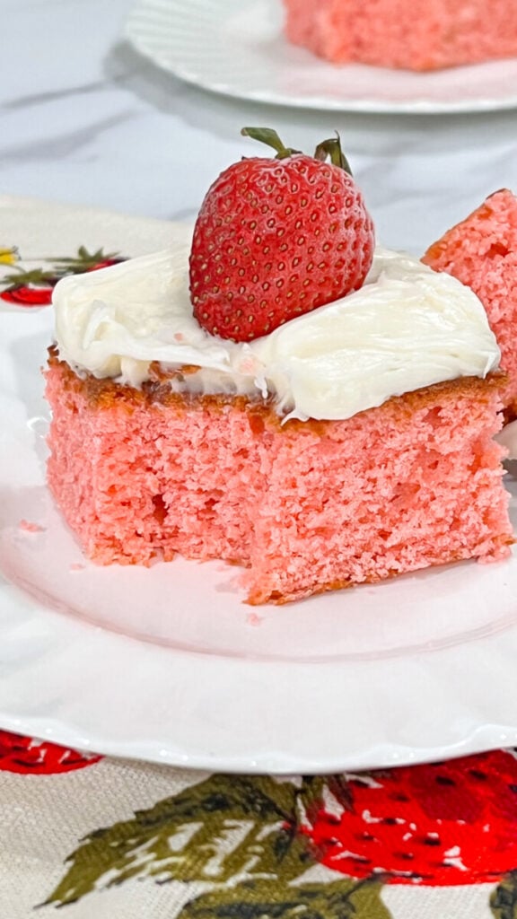 Strawberry gelatin adds that classic nostalgic flavor and enhances the color, while a touch of pink food coloring gives it that soft bakery-style look. Topped with a rich, creamy cream cheese icing, this cake is the perfect balance of sweet and tangy.