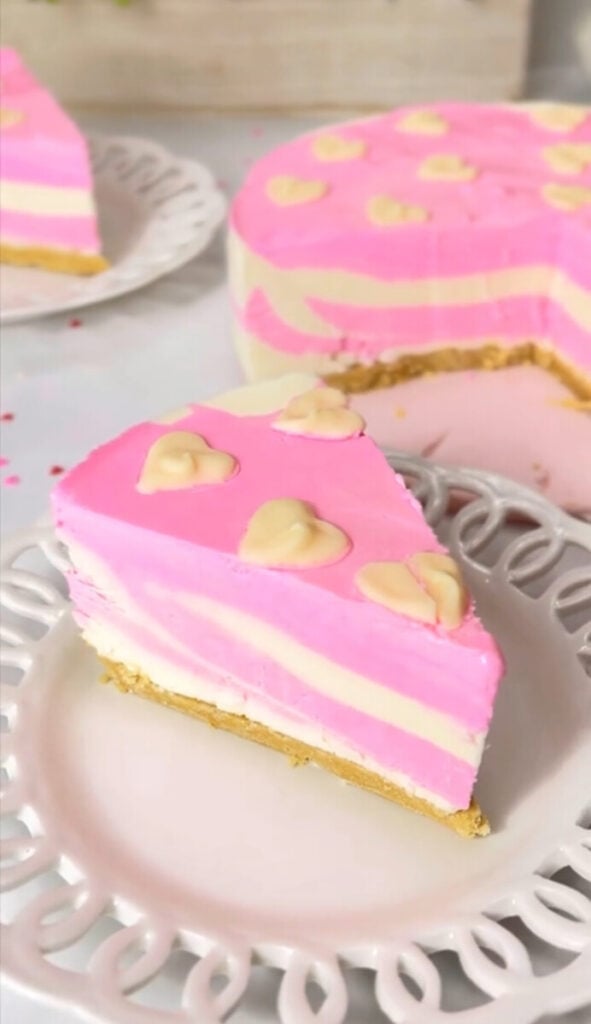 This cheesecake turned out even prettier than I imagined. I love how the pink and white layers swirl together without needing any special technique — just simple scoops layered one on top of the other. Once sliced, it looks so soft and romantic, which makes it perfect for Valentine’s Day.