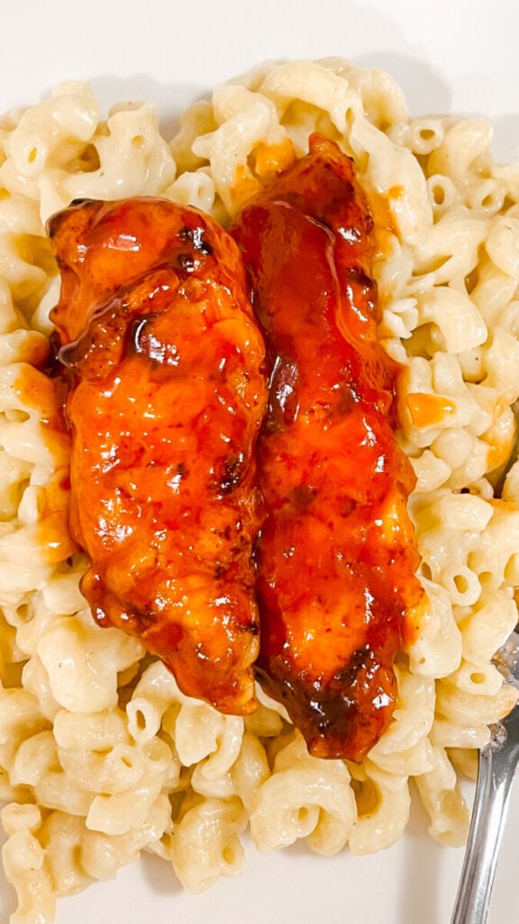 Scoop the mac and cheese onto plates or into bowls. Top with saucy BBQ chicken strips, drizzle with extra BBQ sauce if desired, and serve hot.