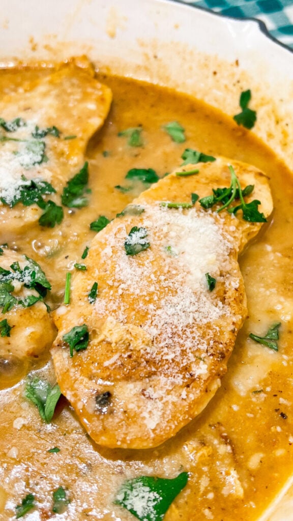 This is the kind of skillet dinner that feels special enough for company but easy enough for a weeknight. The sauce alone is worth making — it’s packed with fresh garlic, real parmesan cheese, and just the right amount of cream to create a luxurious texture without being overly heavy.