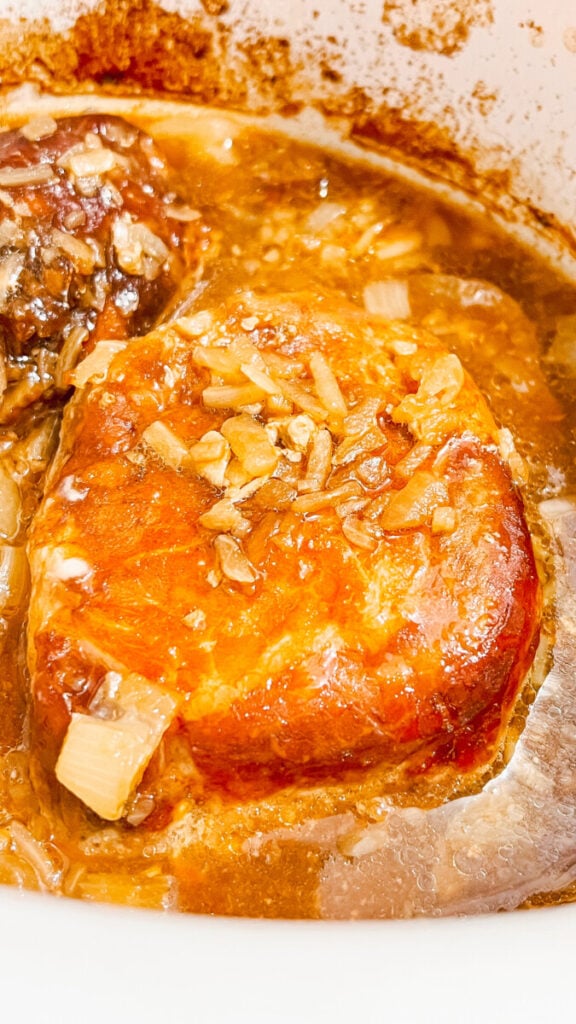 The onions break down beautifully, the pork becomes unbelievably tender, and the sauce is rich and cozy like a homemade French onion soup.