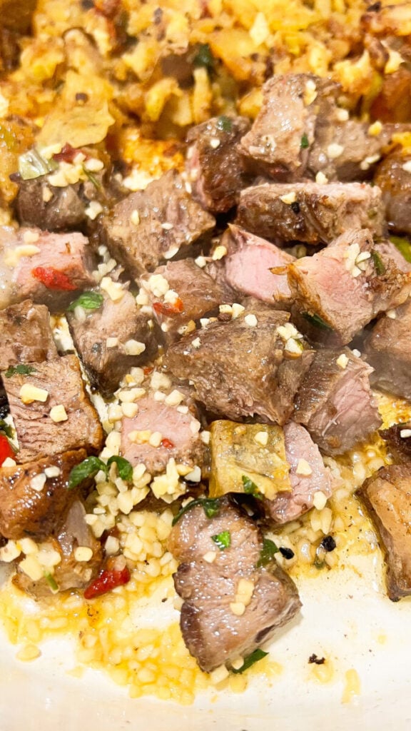 Turn heat to low. Add butter and minced garlic to the pan. Stir for 30 seconds until fragrant. Toss steak bites to coat in the garlic butter. - Garnish and Serve