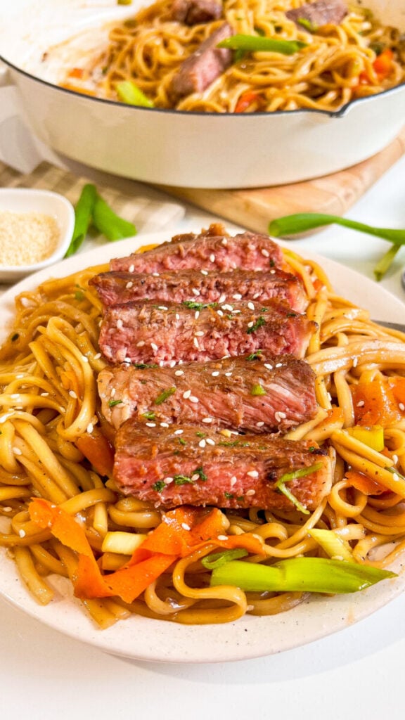 Tender slices of steak are stir-fried with garlic, tossed with chewy udon noodles, and coated in a flavorful sesame-soy sauce that clings to every bite.