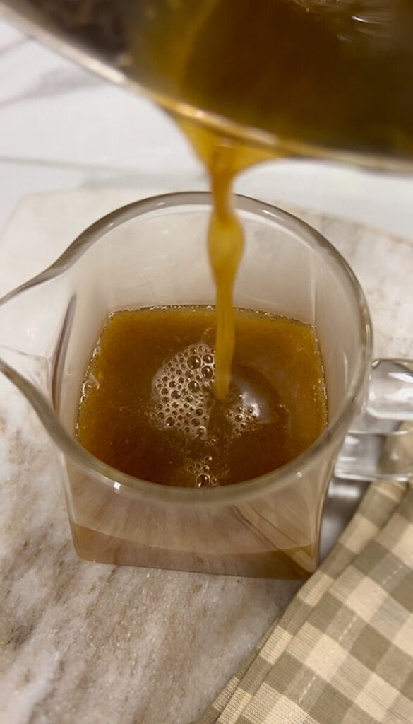 - Place a fine mesh strainer over a bowl and pour the mixture through, separating the liquid syrup from the banana solids.