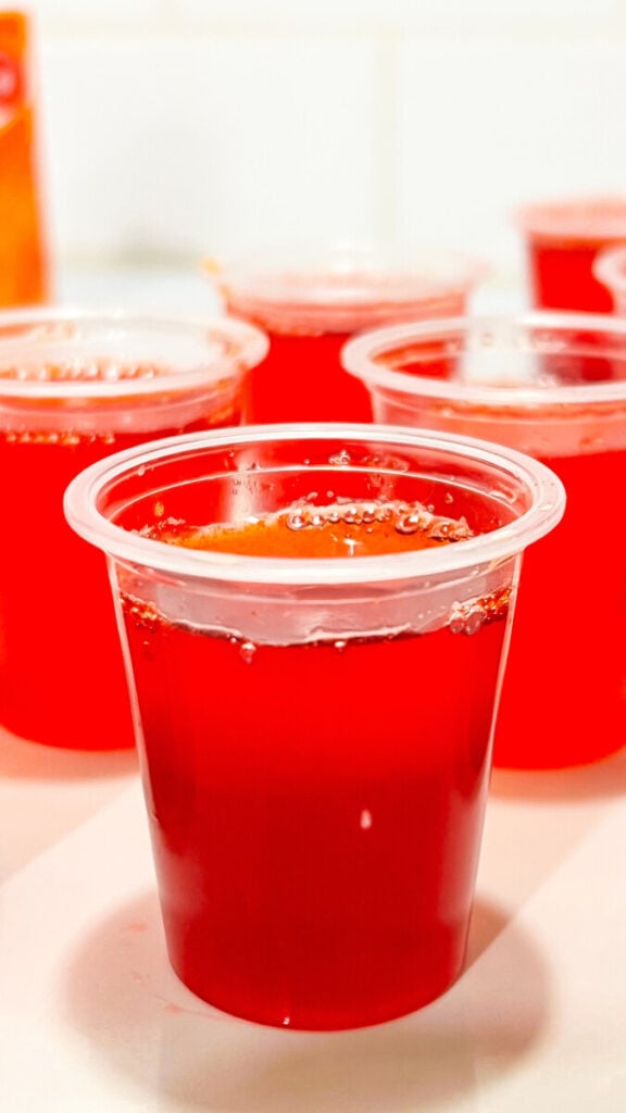 Pour the mixture into small jello shot cups or silicone molds. Refrigerate until fully set, about 2–4 hours.