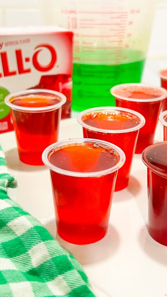 - Pour the mixture into plastic jello shot cups or mini condiment cups and refrigerate for at least 2–3 hours, or until fully set.